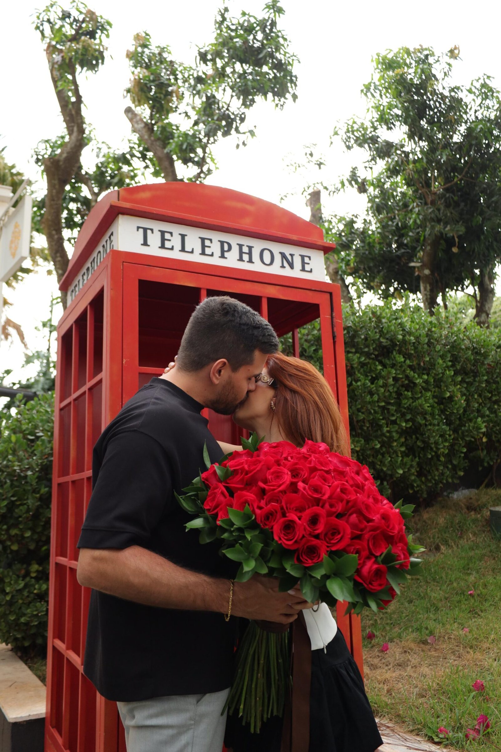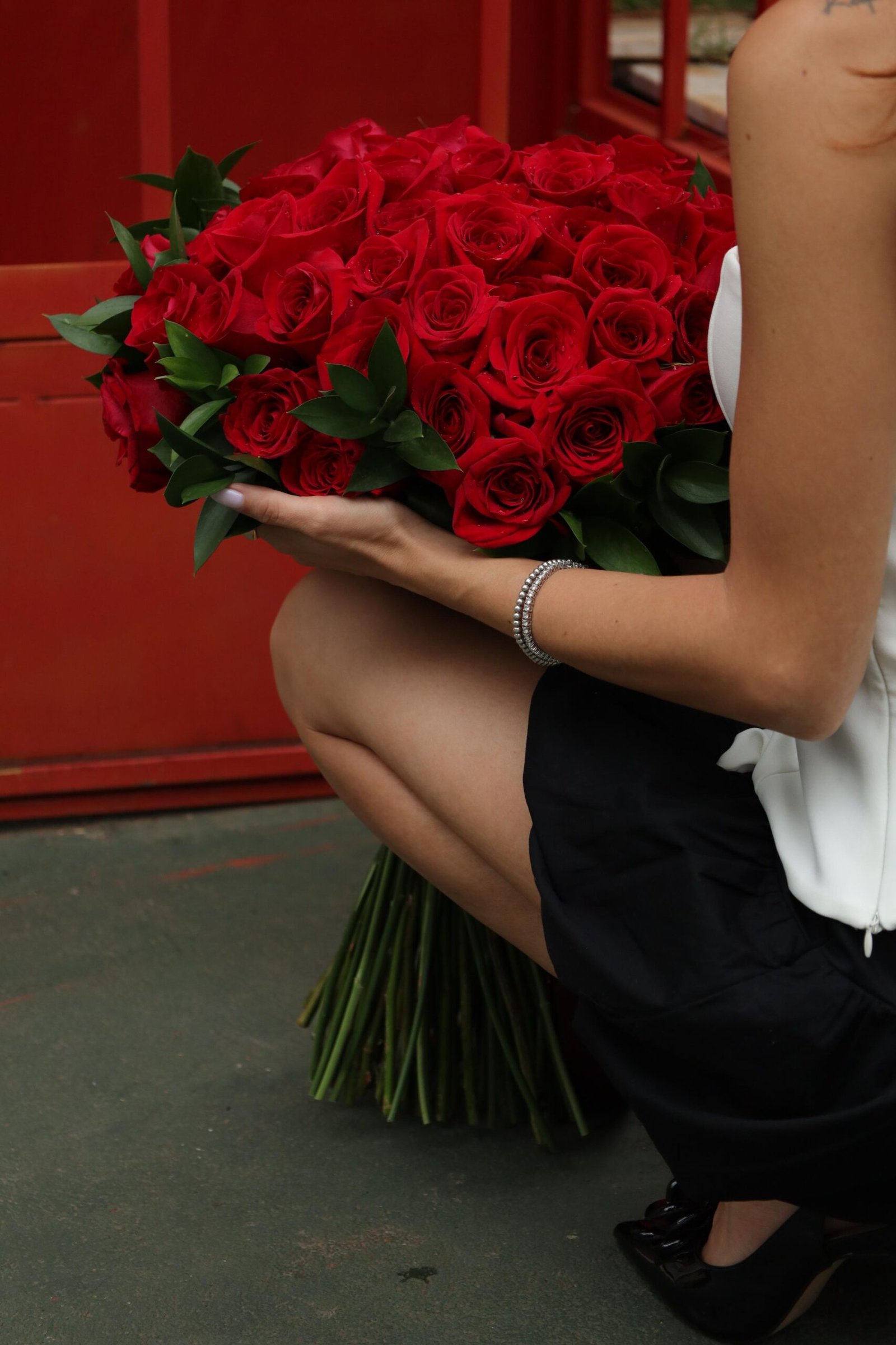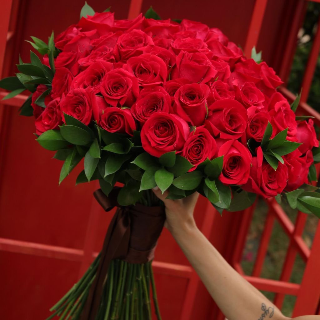 Composição: Buquê SUPREME LOVE com 50 rosas vermelhas importadas do tipo premium com folhagens ruscus e acabamento em laço de cetim marrom.