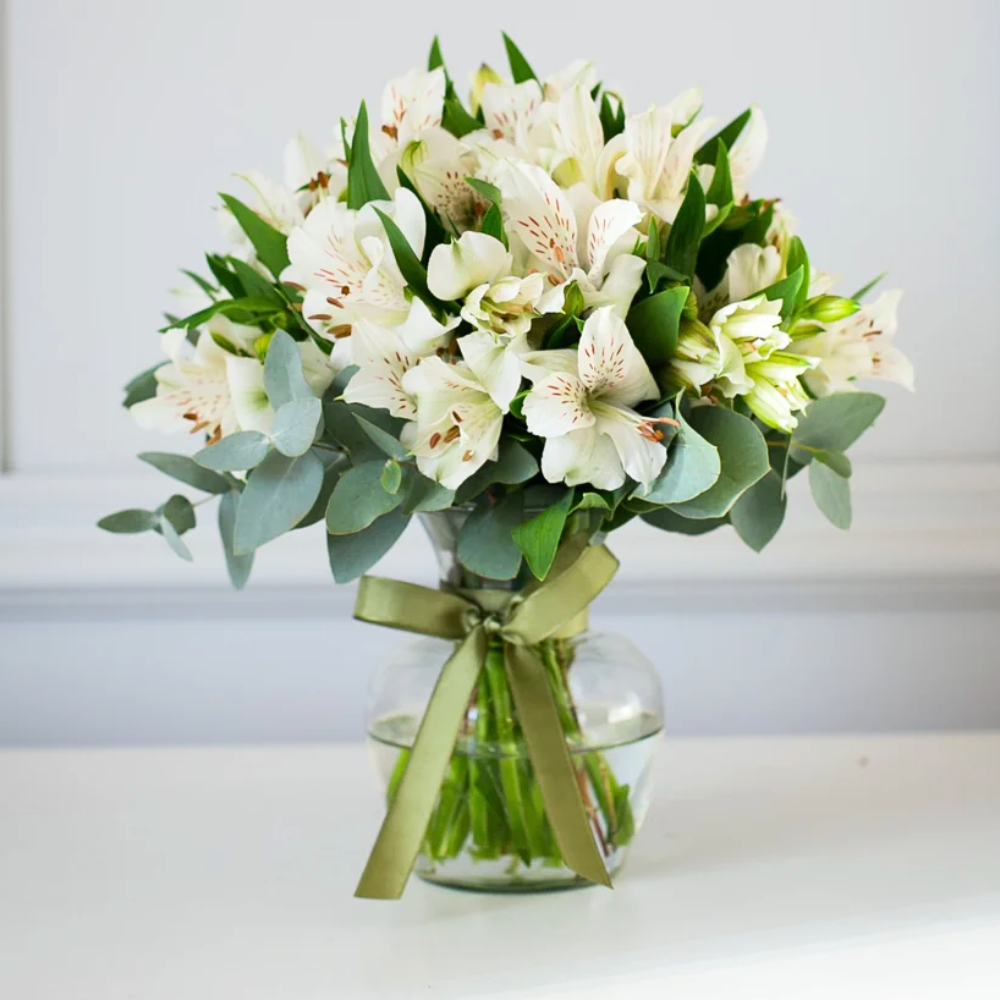 Composição: Vaso de vidro com astromélias brancas e acabamento em laço de fita de cetim.